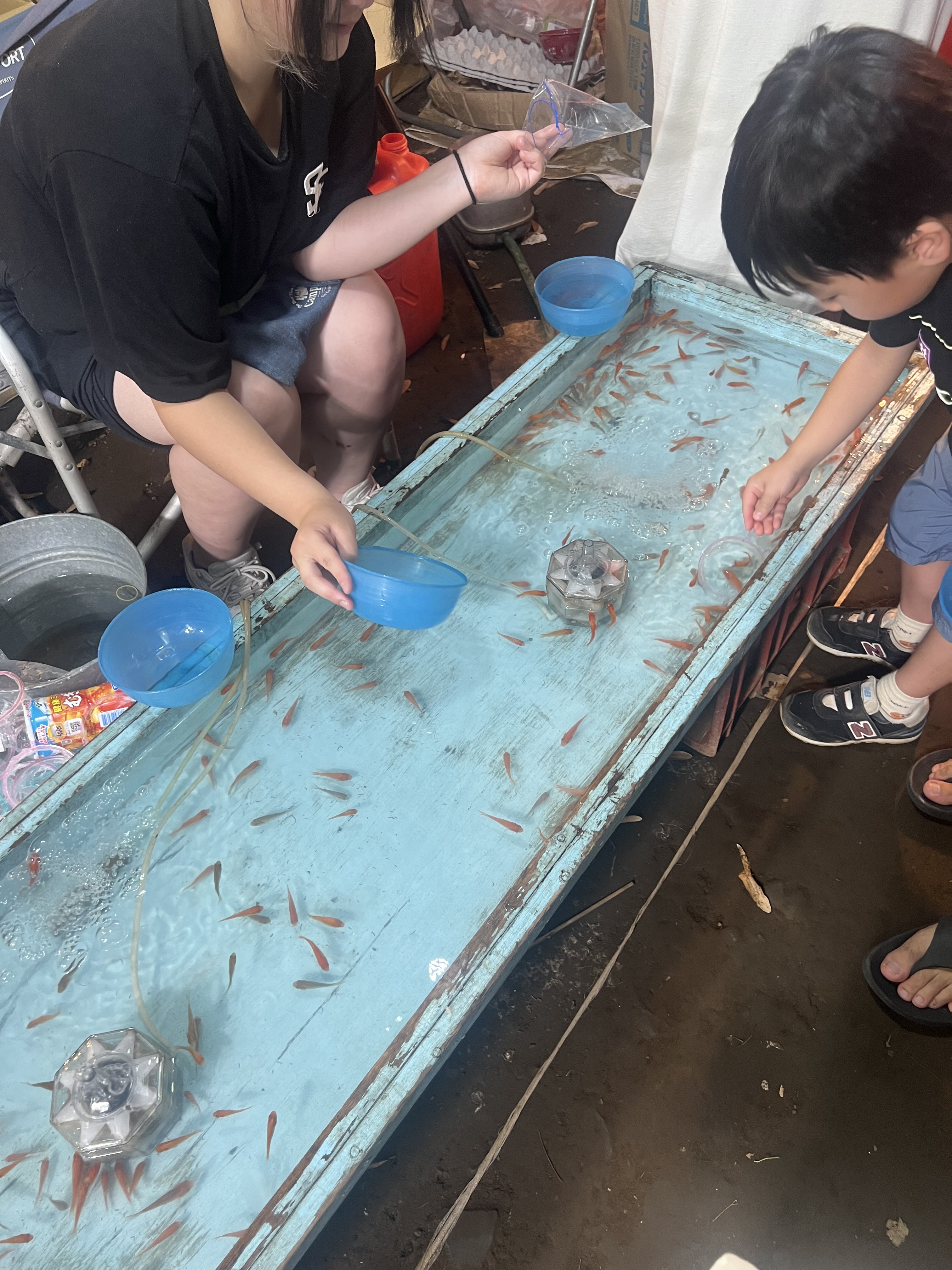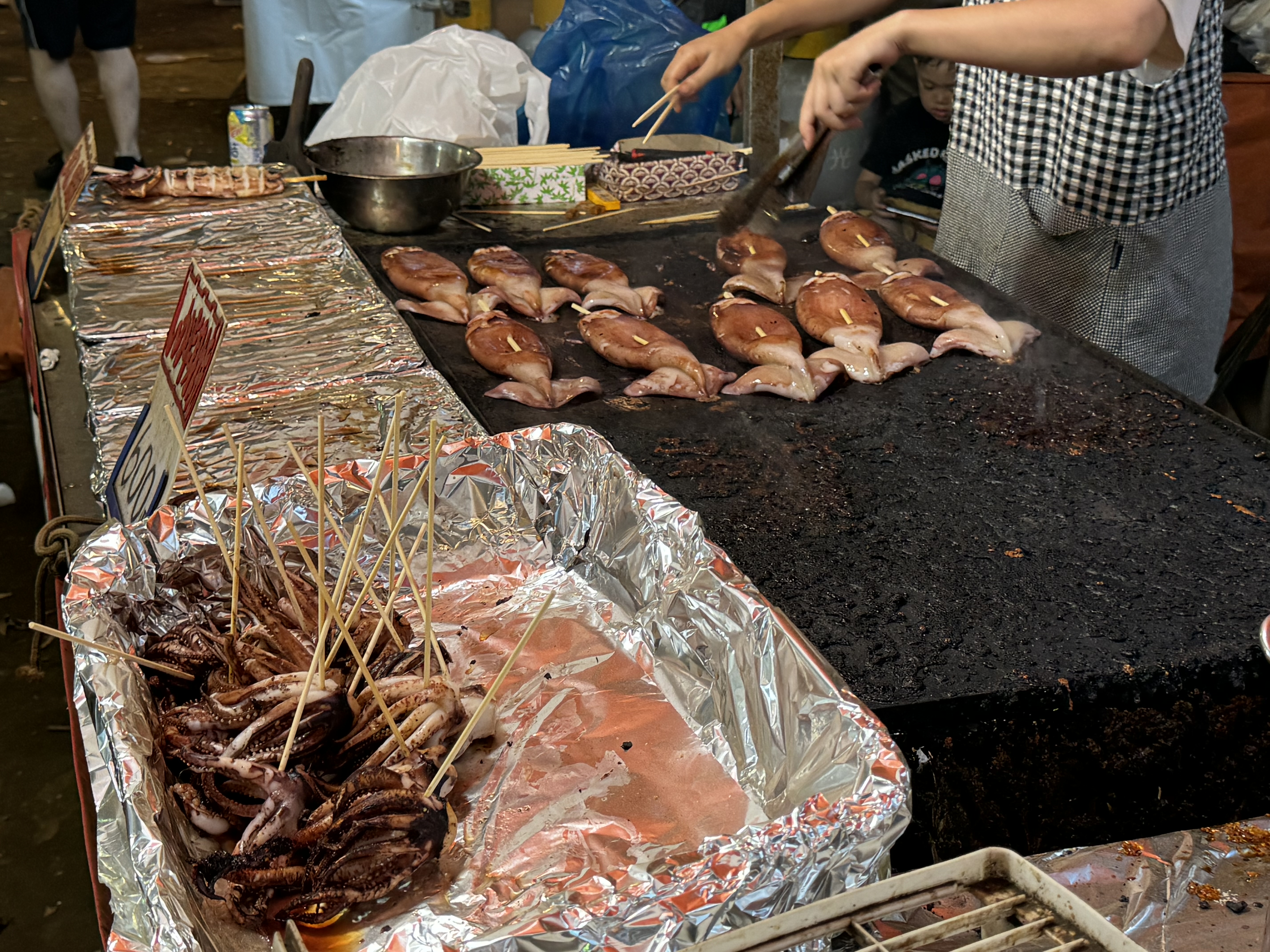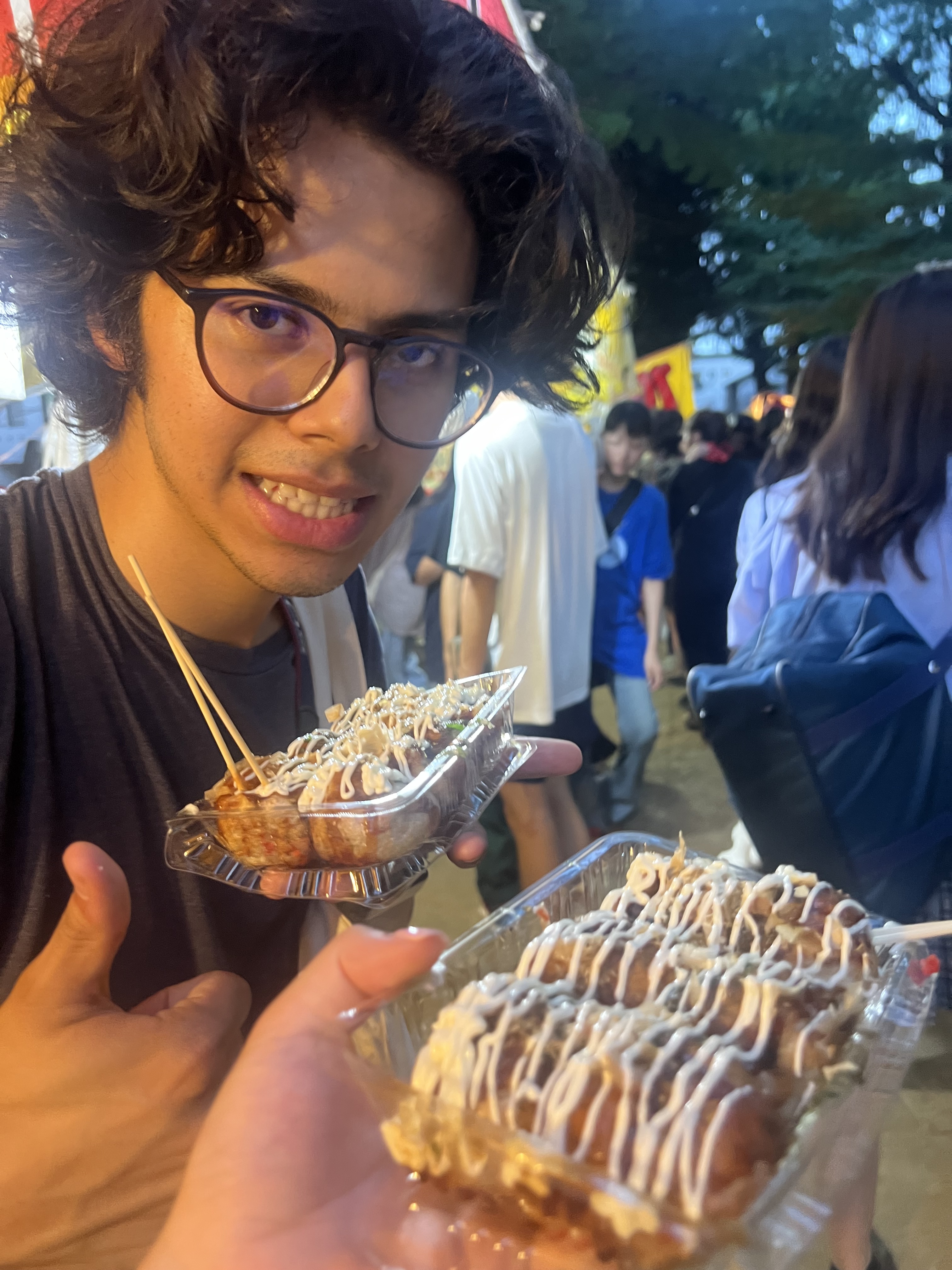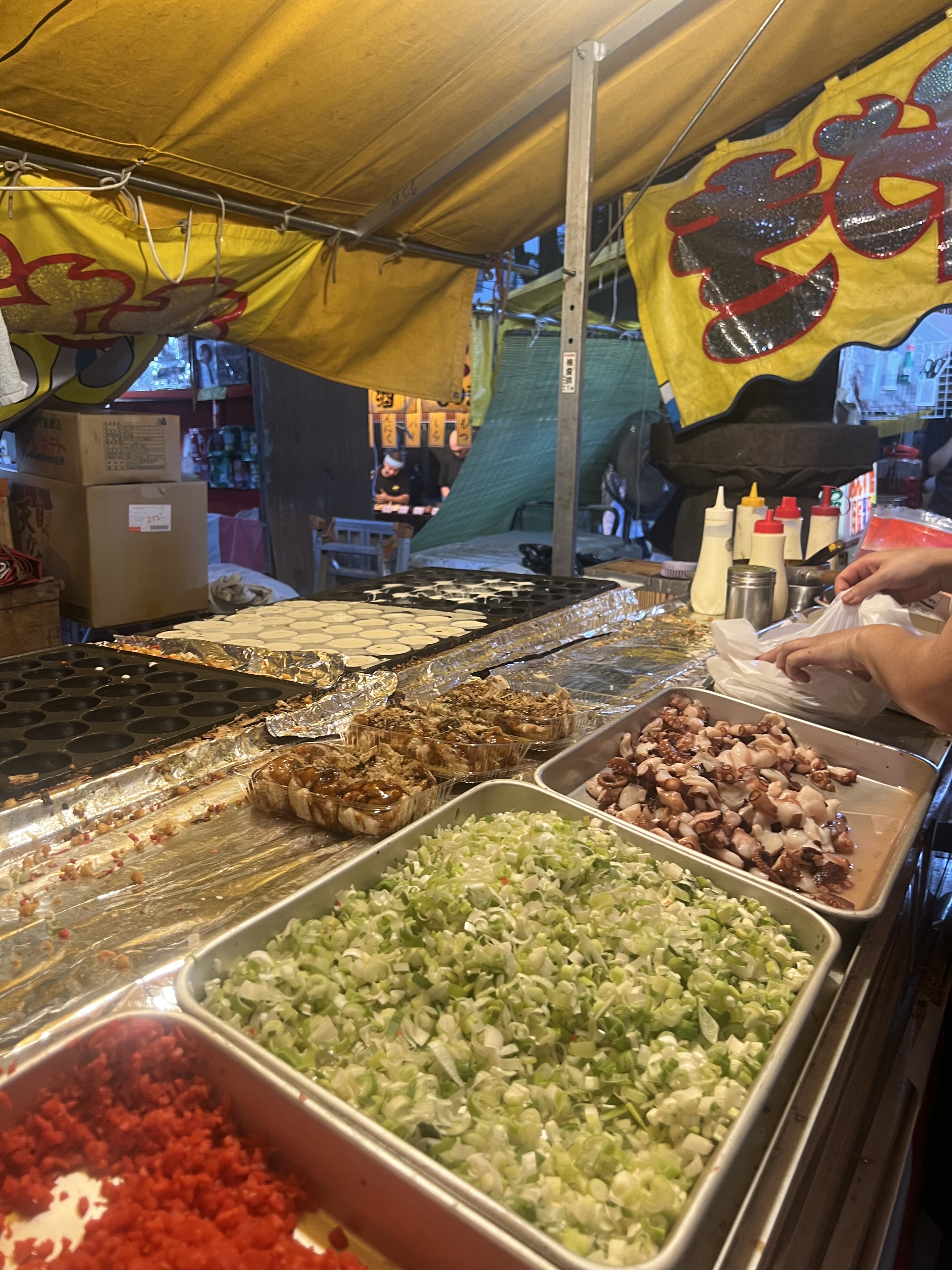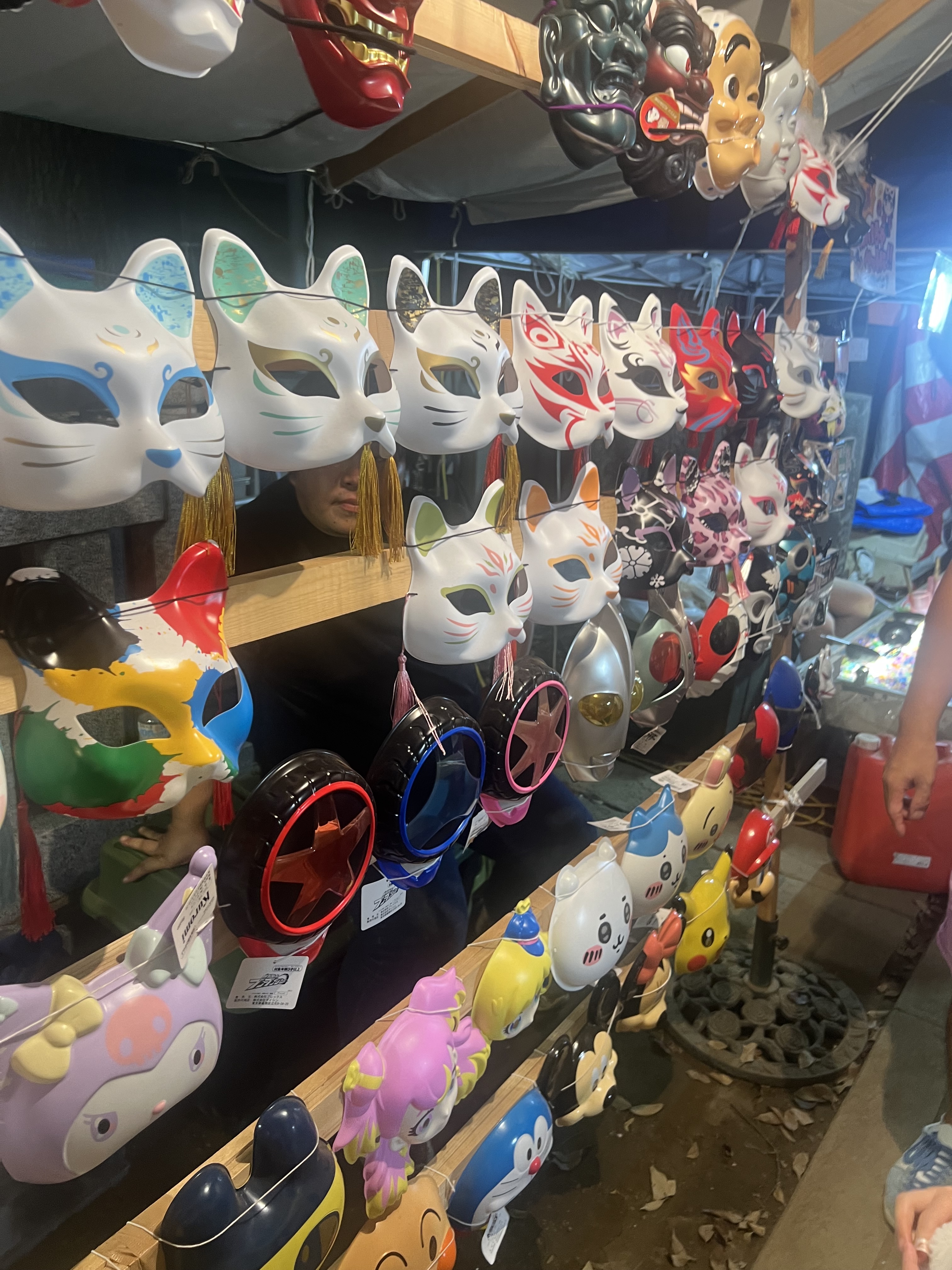 In the evening, hosts from Ochanomizu took us to an Ennichi Festival in Ikebukoro near the Kishimojin Temple. Ennichi refers to the day when a deity was born or has left the world. The festival glowed in the dark with hues of scarlet and orange with dozens of stalls lining the walkway. The air was sizzling with the grilling and frying of the street vendor stalls with mixed aromas. People lined the stalls with clumps of groups and children skirted around while being menaces to each other. I split the six piping hot takoyaki balls with Jo and we stabbed and nudged them with our tiny wooden swords in attempt to get them to cool faster since my patience is always running thin when it comes to festival food. It was mesmerizing to watch the chef deftly rotate the batter into identical spheres – the cooking process has always been a favorite of mine for street food. After eyeing people walk around with refreshing sticks of bright yellow pineapple, I followed suit. It was so juicy, a hint of tart, and a breath of relief in the sweaty heat. After getting split off from the group due to my pineapple endeavor, I ran into Andy and Kelly who were deep in conversation while also enjoying takoyaki under a tree. Not wanting to intrude onto their conversation further, I stepped back into the bustling air of the festival to wander back to the front entrance to find people.