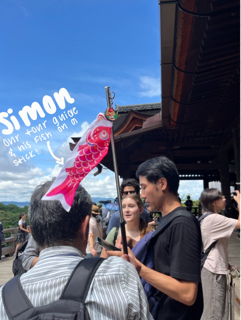 When everyone gathered at the meeting spot, we met our tour guide whose name was Simon. Simon was an older man who was very knowledgeable about the history, shrines, and temples. We all loved Simon for guiding us through the site and we will always remember his fish on a stick that weaved through all the steps and uphill climbs.