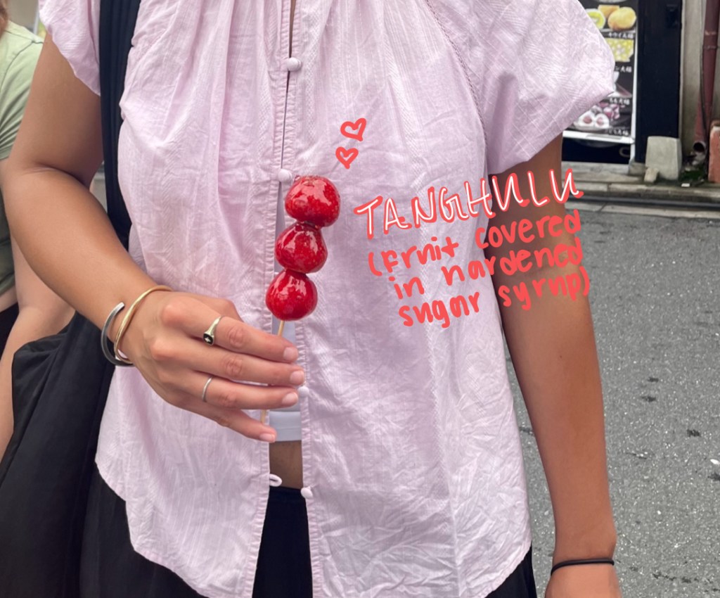 As we got off the bus stop, an uphill battle awaited us at 9:30 in the morning. After each leg carried the other on the incline, we walked past many small shops filled with souvenirs, sweet treats, and more. While waiting for the other half of the group to catch up, we stopped in front of a Tanghulu shop. Me, Gillian, and Kelly all bought sugar-coated strawberries to ease our breathless journey.