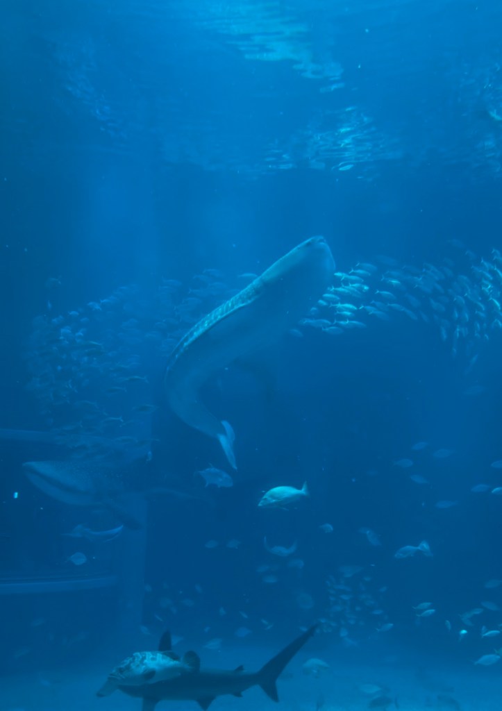 By coincidence, I arrived at feeding time for the mega central tank. I watched the whale sharks follow the scuba care taker as the ginormous fish opened its mouth and siphoned food though a whirlpool. As I reached the bottom of the tank, so did the fish feed. Small sharks sat at the bottom in piles, unmoving as if in a food coma. Rays swooped down for their fair share too.