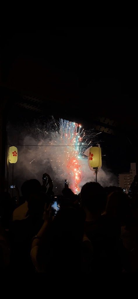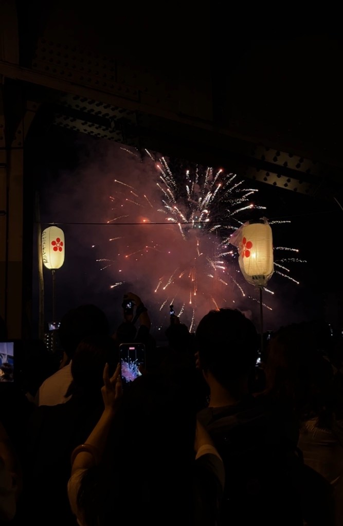 As the night was coming to an end, Romi, Kerem and I decided to go to Osaka to experience the festival of lights. There would be fireworks for a whole hour that we would be able to see. Once we got there, we were surrounded by girls in their yukatas and wooden sandals, clacking everywhere, laughing and having fun. The energy was lively and excited me for what was coming. We could hear the fireworks the minute we stepped outside the train station and followed them to the bridge where we would be able to see them. The crowd grew exponentially the closer we got. We were packed like sardines in a can, mushed together trying to squeeze through the crowd to see the fireworks. To say we struggled would be an understatement. However, we persevered and got past crowds of people onto the bridge.