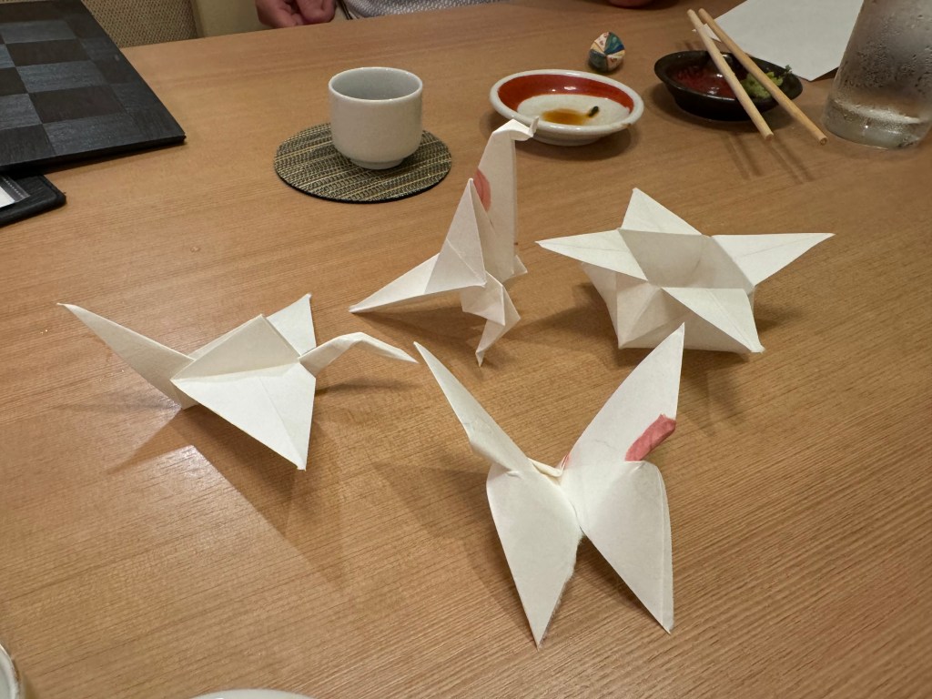 Tuna, squid, scallop, red snapper, sea bass, red shrimp, abalone, herring roe…my eyes widened at the sight of the spread. My favorites were the tuna and the scallop, the tuna surprising me especially as it holds one of my lower sashimi rankings. With perfect stripes of buttery fat, the deep red flesh created a delicious blend of flavor on my tongue, unlike any tuna I had ever had before. The three of us enjoyed those pieces especially, enough to order a few additional nigiri to round out our post-dinner “snack.” Between bites, Tom and I folded several origami creations out of the sheet of paper meant to be a placemat (?), commenting on each other’s skill.
