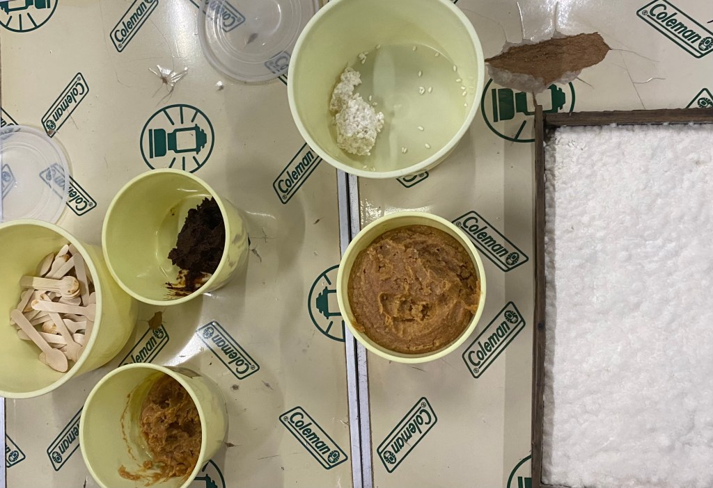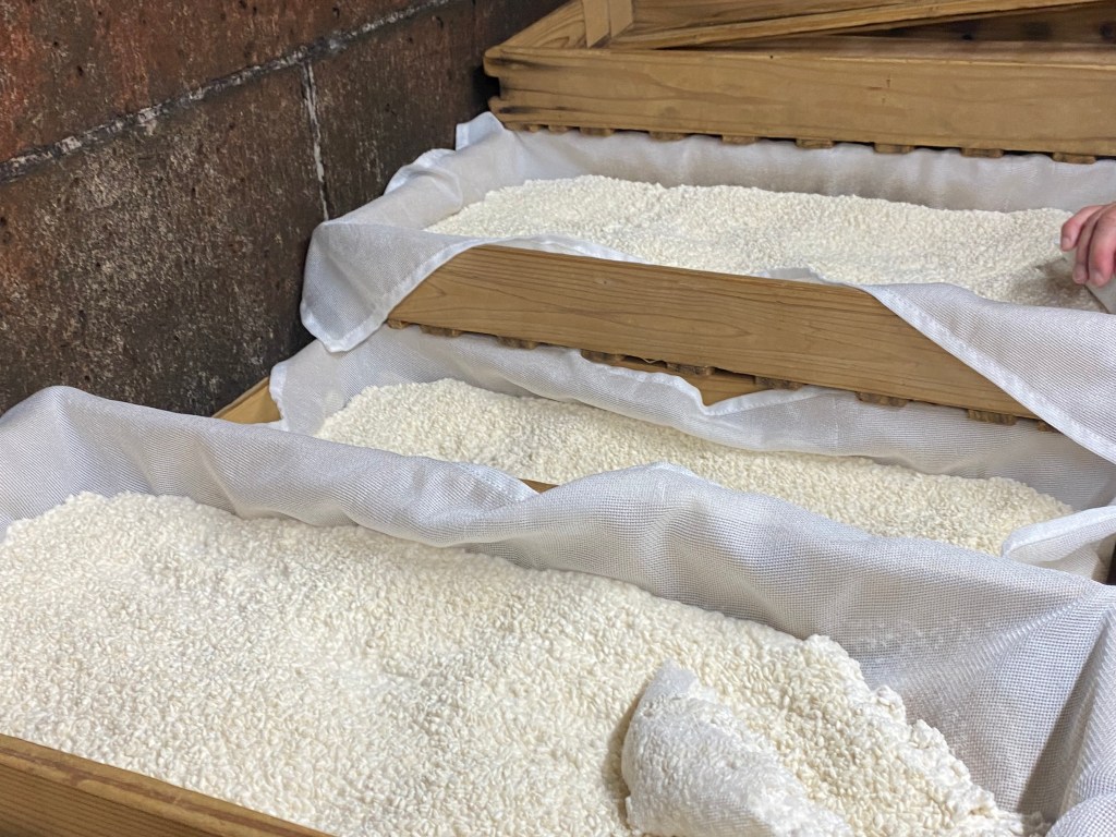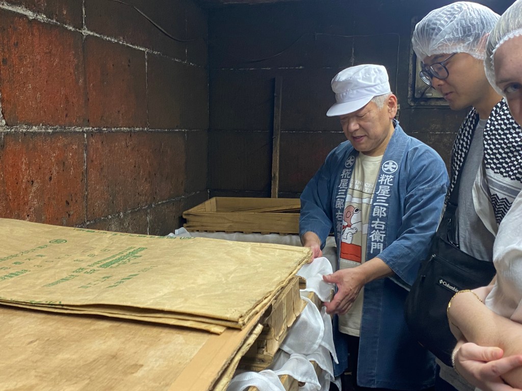 Upon arriving at the factory, which is more accurately referred to as a storehouse, we were given hair nets to keep sanitary standards and was then led inside by Mr. Tsujita, the owner. First stop, koji. We entered the storage room for koji in groups of 4 through what looked like a hobbit sized opening. However, inside were stacks of fluffy rice koji that in the words of my classmate, Summer Lam, “looks like rice crispies”. The koji was harvested from steamed rice, inoculated with A. oryzae and grown for at least 2 days at 32°C, 70% humidity.